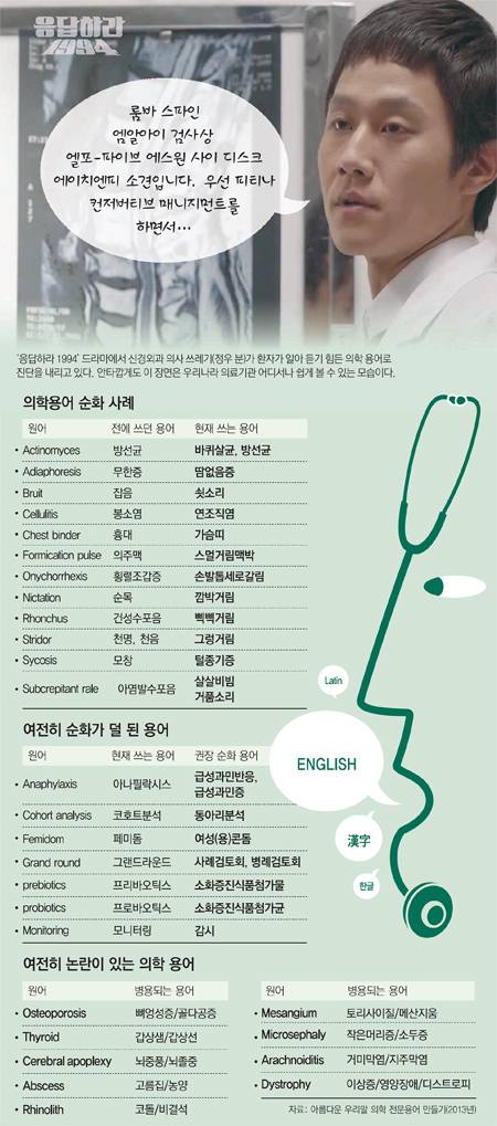 국내 드라마, 수입 드라마를 막론하고 의사가 등장하는 드라마의 공통점은 자막이 항상 등장한다는 것이다. 외계어로 느껴질 만큼 난해한 영어로 된 의학용어를 설명하기 위해서다. 이처럼 우리 의사들이 영어로 대화하는 건 현장에서는 지극히 당연한 일. 오히려 "허리뼈 MRI상 4, 5번 허리뼈와 1번 엉치뼈 부분에 디스크 증세가 있네요. 우선 물리치료나 완화 치료를 하면서…"라며 쉽게 설명하는 의사보다는 쓰레기 같은 의사가 더 많은 게 우리 의료계의 현주소다.