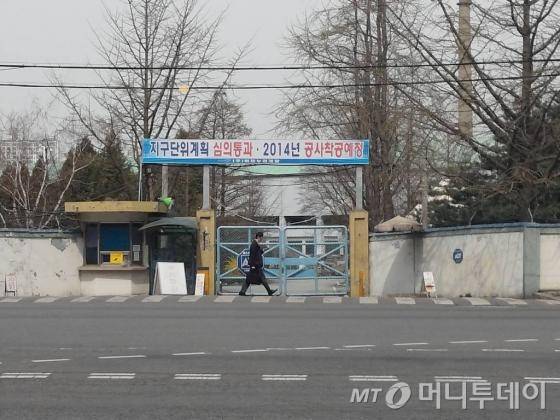영등포교도소 입구. 개발사업자가 내건 지구단위계획 통과를 환영하는 현수막이 걸려있다./사진=지영호 기자 |