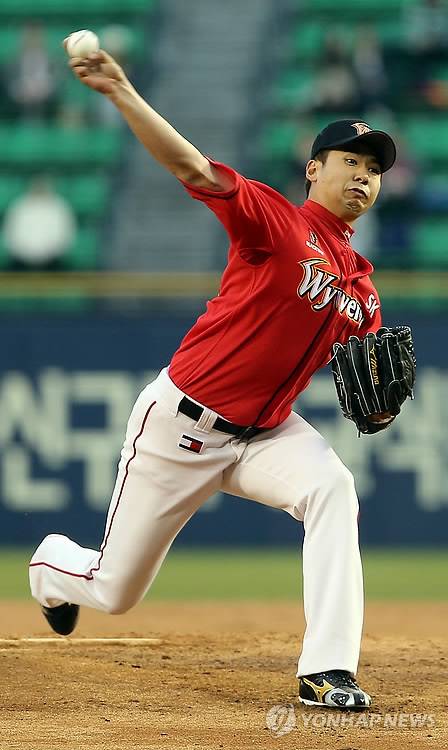 (서울=연합뉴스) 한종찬 기자 = 8일 오후 서울 잠실구장에서 열린 2014 한국야쿠르트 세븐 프로야구 두산과 SK의 경기. SK 선발 투수 윤희상이 역투하고 있다. 2014.4.8