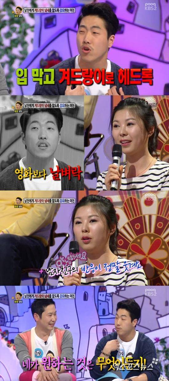 14일 방송된 KBS2 예능 '안녕하세요'에 등장한 사연의 주인공은 "내 여자친구는 자기 겨드랑이 냄새를 맡아 보라고 한다. 항상 마지막 소원이라고 한다. 질식해서 죽을 것 같다"라고 고민을 토로했다.