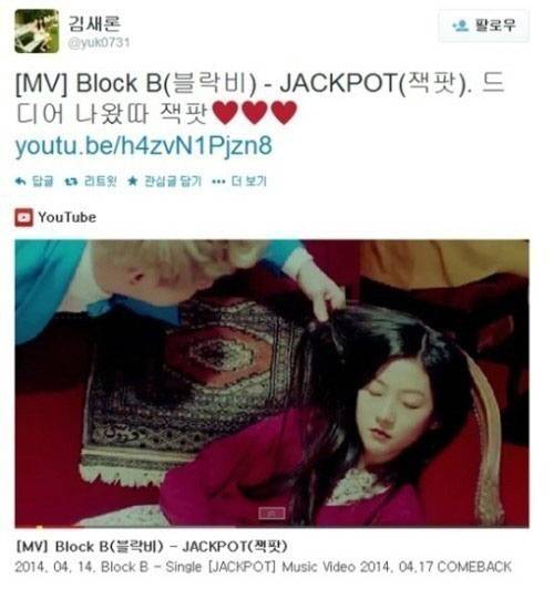 김새론은 15일 자신의 트위터 "[MV] Block B(블락비) - JACKPOT(잭팟). 드디어 나왔다 잭팟"이라는 글과 함께 블락비의 '잭팟' 뮤직비디오를 링크했다.