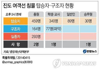 중앙재난안전대책본부(중대본)는 오후 5시 현재 안산 단원고 2학년 정차웅 학생과 선사 여직원 박지영(27)씨 등 2명이 숨지고 164명이 구조됐으며 293명의 생사가 확인되지 않은 상태라고 밝혔다.