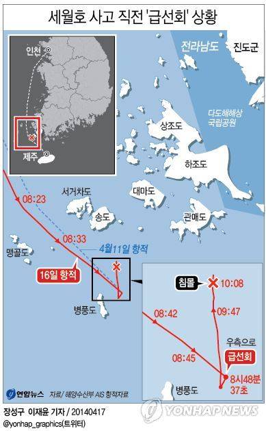 17일 해양수산부에 따르면 선박자동식별장치(AIS)의 항적 분석 결과, 사고 직전 세월호의 항로가 갑자기 바뀐 것으로 나타났다.