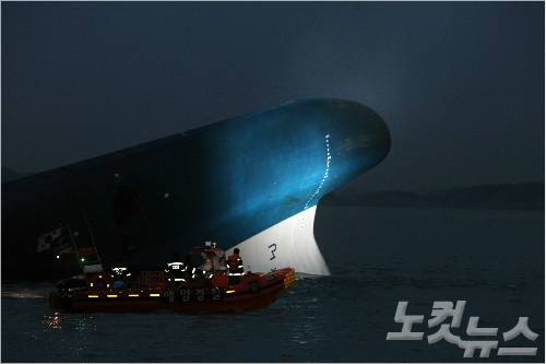 ↑ 16일 오후 전남 진도군 관매도 인근 해상에서 인천에서 제주로 향하던 여객선 세월호가 선수쪽 선저부분을 제외한 나머지 부분 모두 침몰한 가운데 구조대원들이 야간 구조작업을 벌이고 있다. (윤성호 기자/자료사진) |