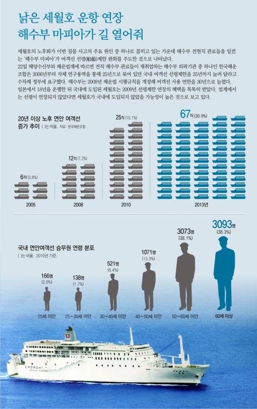 국내 여객선의 선령은 1997년 이후 기본 20년에 안전 점검 후 5년을 연장할 수 있어 최대 25년으로 제한돼 있었다. 해운조합이 이 선령제한 완화를 요구하자 해수부는 2009년 해운법 시행규칙을 개정해 여객선 사용 연한을 30년으로 늘렸다. 해운조합은 당시 서울대 해양시스템공학연구소에 연구용역까지 맡기며 여객선 사용연한 연장을 주도했다. 해운조합은 '여객선 선령제한의 적정성 판단 및 개선방안 연구'를 공개하며 "조선 기술이 비약적으로 상승했고 선박에 사용되는 강재의 질도 발달했다"며 "연안여객선 업계의 경쟁력을 높이기 위해 선령제한을 35년으로 높여야 한다"고 주장했다.