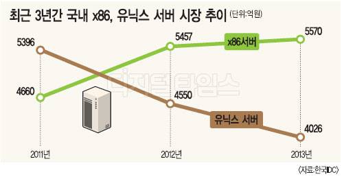 지난해 국내 유닉스 서버시장 규모는 4026억원으로 전년대비 10% 가까이 하락했다. x86서버 시장이 소폭 상승해 5570억원을 기록한 것과 비교해, 유닉스 시장은 지속적으로 하락하고 있는 상황이다. 과거 유닉스 서버는 전용 OS나 애플리케이션으로 안정성이 장점으로 꼽혔지만, 개방형 환경이 대두됨에 따라 저렴하고 유연한 x86서버에 밀려 설자리를 잃고 있다.