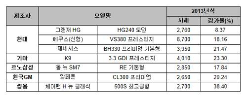 중고차 전문기업 SK엔카는 2013년식 국산 중고 대형차의 감가율을 조사한 결과, 현대차 그랜저 HG HG240 모던 감가율이 8.37%로 가장 낮았다고 29일 밝혔다.