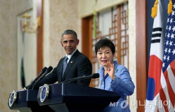 지난 25일 박근혜 대통령과 버락 오바마 대통령이 청와대에서 정상회담을 가진 뒤 공동기자회견을 하고 있다/사진=청와대 제공 |