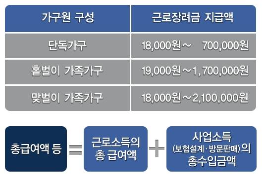 근로장려금이란 소득이 적어 생활고를 겪는 근로자와 사업자 가구에 대해 가구원 구성, 총 소득, 재산현황, 총급여액에 따라 최저 18만원에서 최대 210만원까지 지원금을 주는 제도입니다.