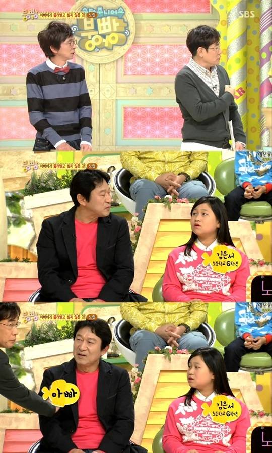 이어 은서는 "아빠는 노안 때문에 항상 할아버지 역할만 맡는다. 다 아빠가 노안이기 때문이다"고 밝혔다. 이어 김응수의 나이가 화제가 됐다. 지금까지 김응수의 나이를 들은 이가 아무도 없기 때문. 김응수는 1961년생 53세로 이경규보다 동생이다. 이에 김응수는 "경규 형한테만 형이라고 한다"고 해 웃음을 자아냈다. 이경규는 1960년생이다.