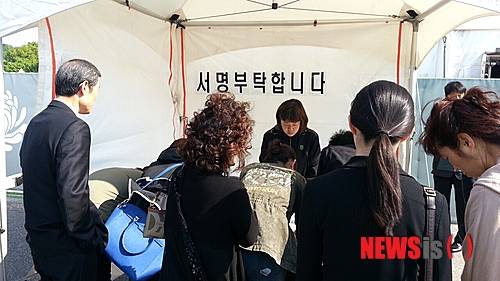 밤새 잠을 이루지 못한 듯 초췌한 얼굴로 분향소 앞에 나온 이들은 헌화를 마치고 나오는 조문객들에게 서명을 부탁했다.