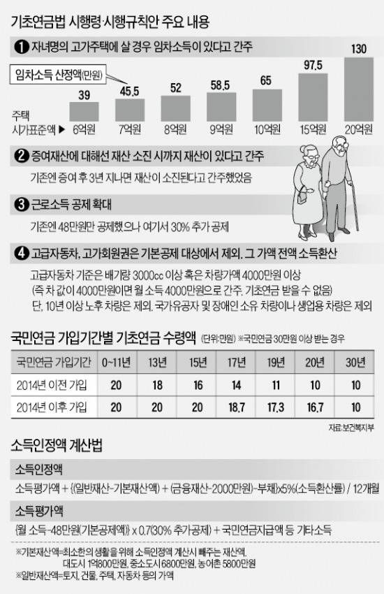 "현재 65세 이상 노인 639만명 중 447만명이 대상이다. 이 중 국민연금을 월 30만원 이하로 받거나 국민연금 가입기간이 12년이 안 되는 406만명은 20만원 전액을 수령하게 된다. 나머지 41만명은 국민연금 가입기간에 따라 차등 지급된다. 국민연금 수령액이 월 30만원 이하면 가입기간에 상관없이 무조건 월 20만원씩 받는다."