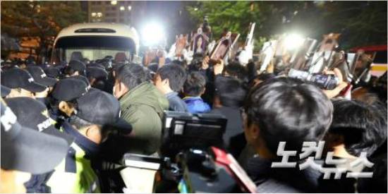 ↑ 세월호 사망자가 연간 교통사고 사망자보다 적다는 KBS 보도국장의 발언이 큰 파장을 낳고 있는 가운데 세월호 참사 유가족들이 8일 밤 서울 여의도 KBS앞에서 보도국장의 면담을 요구하며 경찰과 대치하고 있다. 황진환 기자 |