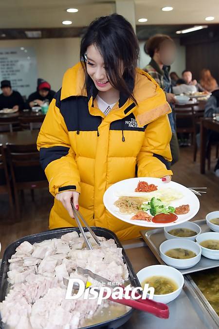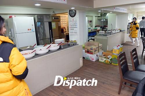 식당에 도착했습니다. 스태프들 뒤에 조용히 자리를 잡았습니다. 의상도 갈아입지 못했습니다. 노란색 패딩 하나만 급히 걸치고, 줄을 서시오~