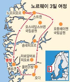 출발지는 베르겐이다. 피오르의 관문인 항구도시다. 원래는 옛 한자(Hansa)동맹 당시의 흔적이 여태 남은 상관(商館) 건물군(群) '브뤼겐'으로 이름을 알린 역사문화도시다. 최근엔 애니메이션 '겨울왕국'의 주무대로 더 유명해졌다. 영화 속 '아렌델 왕국'을 둘러싼 자연환경은 피오르, 엘사 공주 등 주인공들이 일상을 이어가던 도시의 실제 모델은 베르겐이었던 것으로 전해진다.
