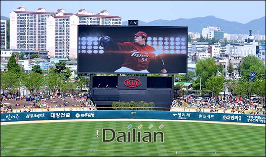 ◇ 광주-KIA 챔피언스필드의 풀HD 전광판은 강한 햇빛에도 불구하고 선명한 화질을 자랑했다. ⓒ 데일리안 김용현 객원기자 |