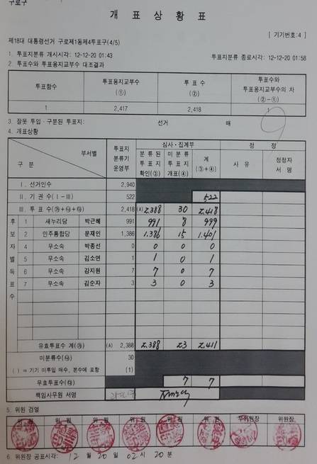 ▲ 지난 대통령선거 구로구 한 투표구의 개표상황표. 투표지분류 개시시각, 투표지분류 종료시각, 위원장 공표시각이 표기돼 있는데 이번 6. 4 지방선거부터는 우측 상단에 표기돼 있는 투표지분류 종료시각이 삭제된다. 투표지분류가 종료되고 위원장 공표까지 진행되는 수개표 시간을 알 수 없게 되는 셈이다. |
