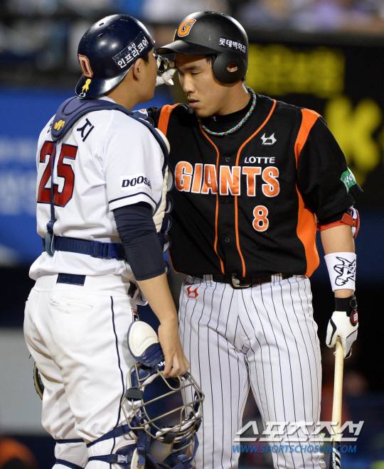 두산과 롯데의 주말 3연전 첫번째 경기가 30일 잠실구장에서 열렸다. 6회초 무사 1루 두산 포수 양의지가 롯데 전준우의 눈에 흙이 들어가자 입으로 불어주고 있다.