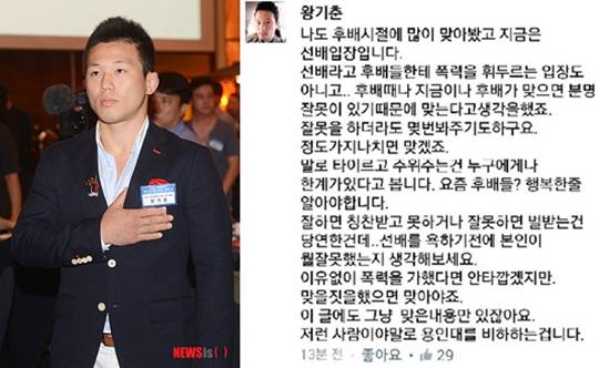 왕기춘은 "나도 후배 시절엔 많이 맞아봤고 지금은 선배 입장"이라며 "선배라고 후배들한테 폭력을 휘두르는 입장도 아니고 후배 때나 지금이나 후배가 맞으면 분명 잘못이 있기 때문에 맞는다고 생각을 했다"고 밝혔다.
