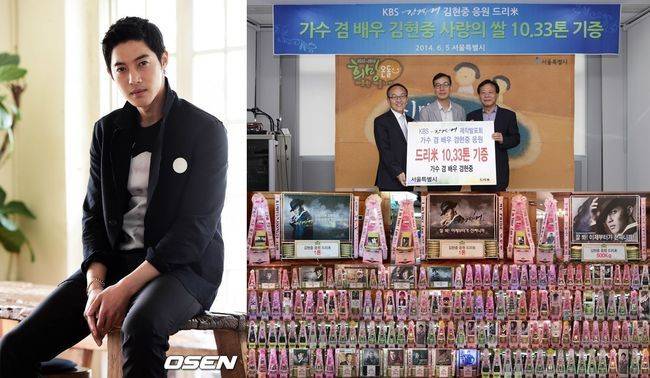 김현중 응원 드리미를 진행한 ㈜드리미는 그의 요청에 따라 서울시에 10톤을 비롯해 지자체 세 곳과 제천영육아원, 울산헤븐노인복지센터, 인천사랑의집, 서울들꽃지역아동센터 등 전국 일곱 개 복지시설에 사랑의 쌀 18.43톤(10kg 1,843포)과 라면 160개, 계란 800개 등을 전달했고 연탄은행에 연탄 1천 680장, 안성유기견보호소에 사료 600kg 등을 기부했다고 5일 밝혔다. 쌀 18.43톤은 1천 840명이 한 달간 먹을 수 있는 양이다. 김현중은 6일 자신의 생일을 앞두고 사랑의 쌀 기부 의사를 밝혀왔다는 전언.