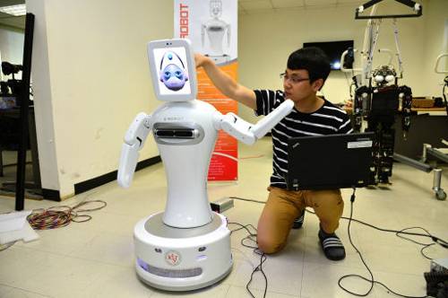 지난 5일 서울 성북구 하월곡동 한국과학기술연구원에서 프론티어 지능로봇사업단 소속 연구원이 '실벗3'의 팔 동작 내구성과 관련한 시험을 진행하고 있다.한국과학기술연구원 제공 |