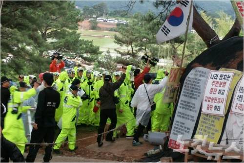 경찰과 밀양시는 11일 아침 6시 10분부터 밀양시 부북면 장동마을 입구에 있는 움막 두곳부터 강제철거에 나섰다.