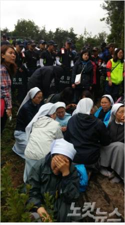 129번 송전탑 농성장 앞에는 수녀 20여 명이 스크럼을 짜고 맞섰지만 결국 경찰에 의해 끌려나갔다.