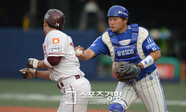 프로야구 삼성 라이온즈 이지영이 12일 서울 목동야구장에서 열린 넥센 히어로즈와의 경기에서 1회말 무사 3루 이택근의 투수앞 땅볼때 서건창을 협살로 잡고 있다. 2014.06.12