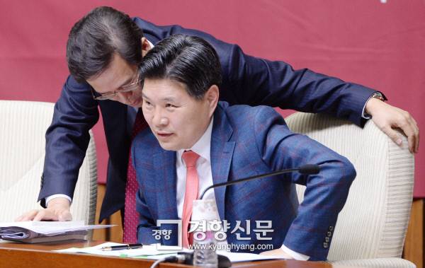 4월 8일 새누리당 원내 대책회의에서 당시 사무총장을 맡고 있던 홍문종 의원(사진 오른쪽)이 함진규 대변인과 이야기를 나누고 있다. / 박민규 기자 |