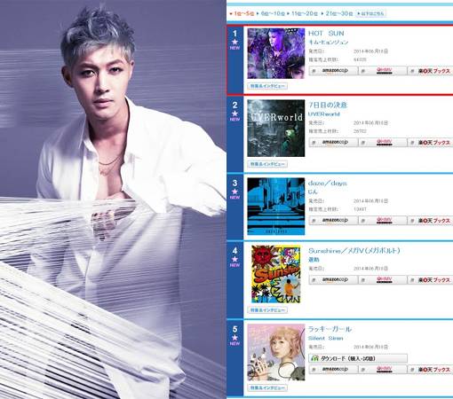 김현중의 일본 네 번째 싱글 앨범 '핫 선'은 18일 발매와 동시에 6만 5000여 장의 판매고를 기록, 오리콘 데일리 차트 1위를 차지한 것. 김현중은 같은 날 앨범을 발매한 일본의 인기 밴드 우버월드(UVERworld)의 신보 판매량의 3배에 달하는 압도적인 기록을 세우며 저력을 과시했다.