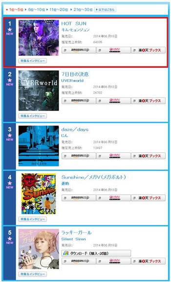 김현중의 일본 네 번째 싱글 앨범 '핫 선'은 18일 발매와 동시에 6만 5000여 장의 판매고를 기록하며 오리콘 데일리 차트 1위를 차지했다. 지난해 6월 일본에서 발매한 세 번째 싱글 '투나잇' 이후 1년 만의 활동임에도 불구하고 열도의 사랑을 한 몸에 받으며 기분 좋은 출발을 알렸다. 이 같은 성과는 최근 '김현중의 재발견'이라는 평가를 이끌어 냈던 드라마 '감격시대'가 오는 8월 일본 DATV 정식 방영을 확정 지은 것과 맞물리면서 김현중을 향한 현지의 관심을 더욱 끌어 올린 것으로 보인다.