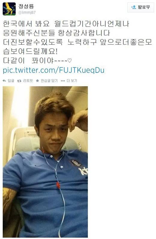 정성룡은 29일 자신의 트위터에 "한국에서 봐요. 월드컵 기간 아니 언제나 응원해주신 분들 항상 감사합니다"고 적고 기내에서 찍은 사진을 올렸다.