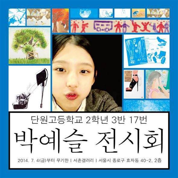 ‘박예슬 전시회(포스터)’가 4일 서울 종로 서촌갤러리에서 열렸다. 갤러리에는 이씨가 제작한 구두 2점에다 예슬양이 생전 남긴 채색화와 드로잉 31점, 예슬양이 스케치한 ‘살고 싶은 집’의 실내 도면을 바탕으로 제작한 집 모형이 전시됐다. 거실에 소파와 TV가 있고 주방엔 식탁을 차린 소박한 집이었다. 초등학교 때 쓴 일기장에는 “구두를 신고 걸으면 또각또각 소리가 나는 것이 좋아”라고 적혀 있었다. 수학여행을 떠나기 직전에 그린 그림에는 ‘박예슬 ㅋ’라는 장난스러운 사인을 남겼다. 17년 생애와 꿈이 66㎡ 전시실 안에 오롯이 담겼다.