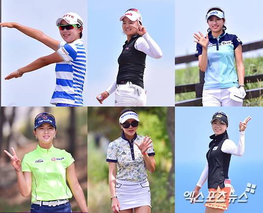 [엑스포츠뉴스=위해(중국), 권혁재 기자] 5일 중국 산둥성 웨이하이포인트 호텔 & 골프리조트 컨트리클럽(파72, 6111야드)에서 열린 한국여자프로골프(KLPGA) 투어 금호타이어 여자오픈(총상금 5억원·우승상금 1억원) 2라운드 경기, (上좌측부터)김효주, 고진영, 김다나, 윤채영, 안신애, 허윤경이 카메라를 향해 포즈를 취하고 있다.