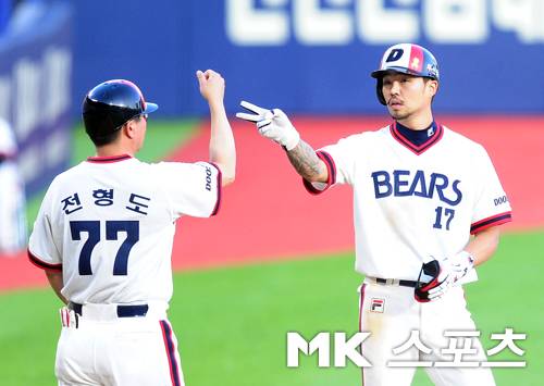 5회말 2사 두산 오재원이 3루타를 날리고 3루 전형도 코치와 하이파이브 하고 있다.