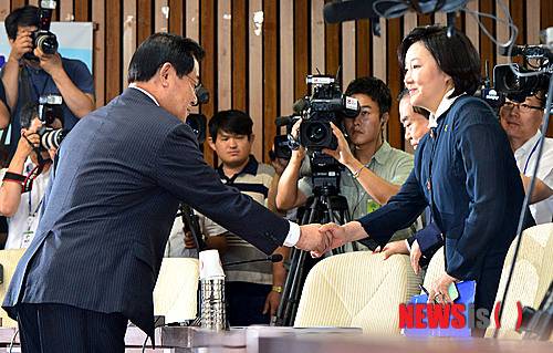 【서울=뉴시스】박동욱 기자 = 이병기 국가정보원장 후보자가 7일 오전 서울 여의도 국회에서 열린 인사청문회에서 새정치민주연합 박영선 원내대표와 악수를 하고 있다. 2014.07.07.