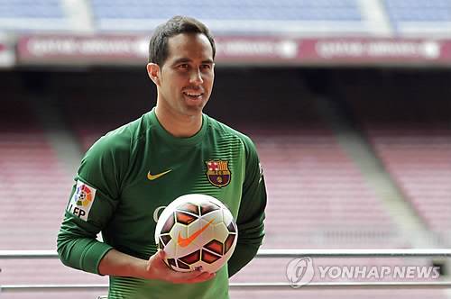 epa04303615 Barcelona FC's new goalkeeper Chilean Claudio Bravo poses for photographers during his official presentation at the Nou Camp stadium in Barcelona, north-eastern Spain, 07 July 2014. EPA/TONI ALBIR