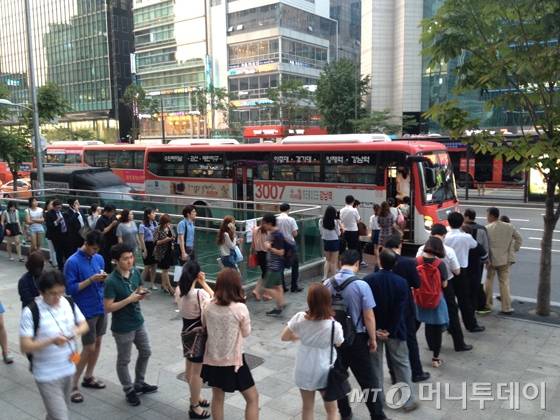 시민들이 서울 지하철 2호선과 신분당선 강남역 인근 정류장에서 경기도 수원과 성남 등으로 가는 광역버스를 기다리고 있다. / 사진 = 이재윤 기자 |