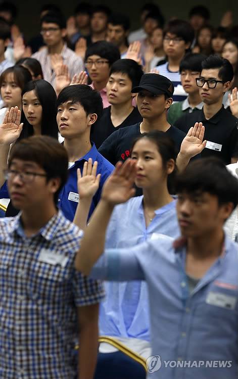 (서울=연합뉴스) 이지은 기자 = 9일 오후 서울 강남구 역삼동 한국과학기술회관에서 열린 '2014 서울세계수학자대회 자원봉사자 발대식'에서 자원봉사자들이 선서를 하고 있다. 서울 대회는 전 세계 수학자 5천여명이 참가한 가운데 내달 13∼21일 9일간 코엑스에서 열린다. 2014.7.9