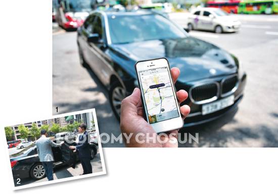 2. 현재 국내에는 프리미엄급인 우버블랙만 들어와 운영되고 있다. 현장에 도착한 택시 기사가 문을 열어주고 있다.