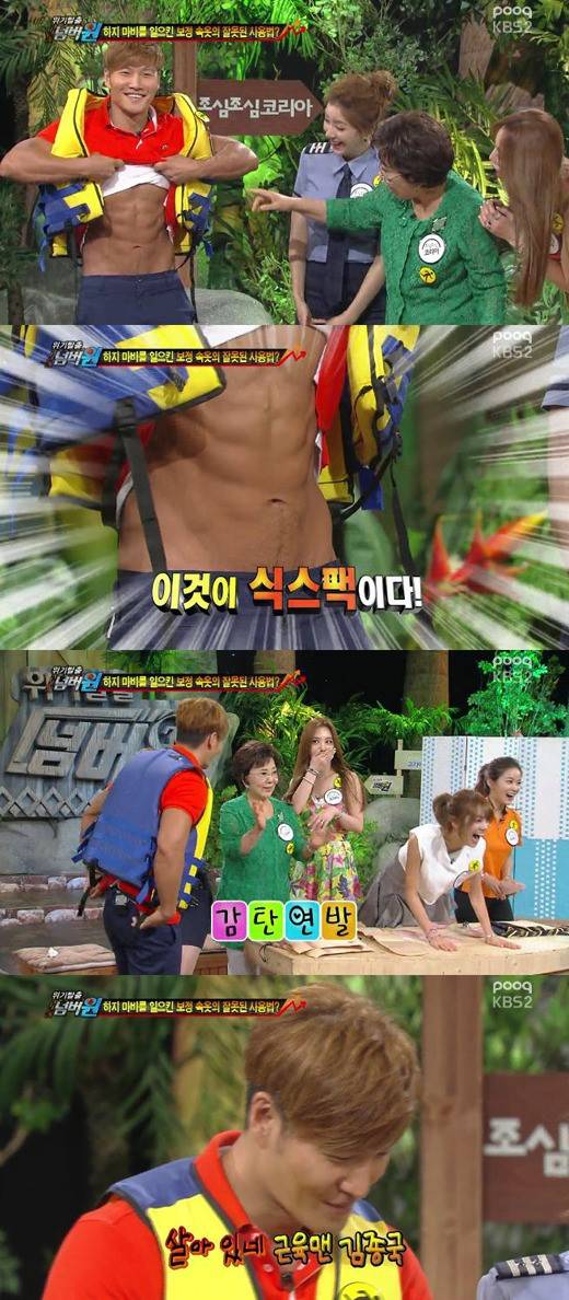이에 김종국은 난감한 표정을 지었지만, 이내 상의를 들어올려 식스팩을 공개했다. 다른 출연자들은 김종국의 탄탄한 복근에 깜짝 놀라며 비명을 질러 웃음을 자아냈다.