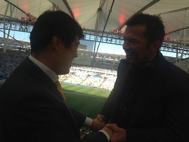 독일의 마지막 월드컵을 들어올렸던 1990년 영웅 마테우스가 바로 옆에서 오프닝을 촬영하다가 분데스리가 선배를 발견합니다.