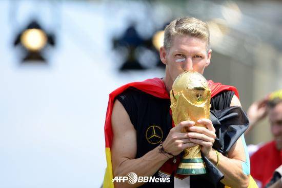 독일의 미드필더 바스티안 슈바인슈타이거(29)가 2014년 브라질월드컵 우승 이후 열린 기념 행사에서 우승 트로피에 입맞춤하고 있다./사진=AFPBBNews |