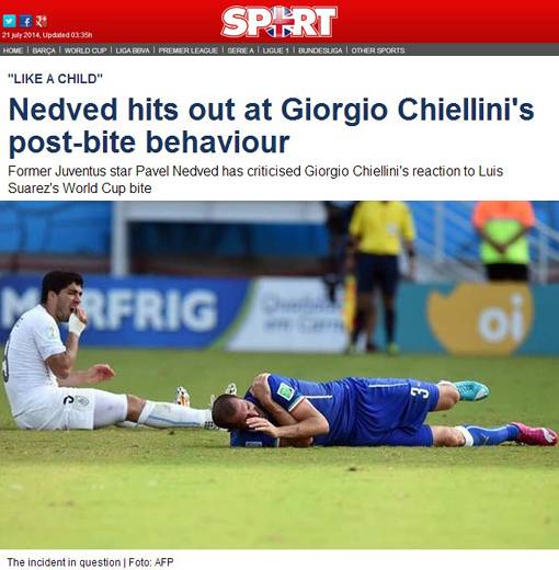 보도에 따르면, 현재 유벤투스의 스포팅 디렉터로 활동하고 있는 네드베드는 "키엘리니가 루이스 수아레스(27·바르셀로나)에게 물린 뒤 보인 행동은 마치 아이 같았다"고 밝혔다.