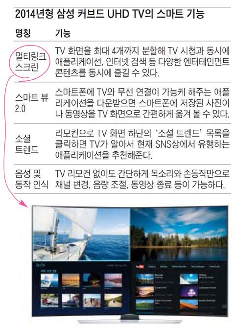한편 2014년형 삼성 스마트 TV 제품 중 '삼성 커브드 UHD TV'는 초고화질 화면과 TV 시청 몰입도를 높여주는 곡선형 패널이 특징이다. 최신 기술인 UHD(Ultra High Definition)는 200만 화소인 풀HD 대비 4배 더 선명한 초고화질로, 실물에 가까운 생생한 영상을 제공하는 게 특징이다. 또한 삼성 커브드 UHD TV는 양옆이 앞으로 살짝 모아진 곡선형 패널로 TV 속 영상에 빨려들어가는 듯해 몰입감을 높여준다.