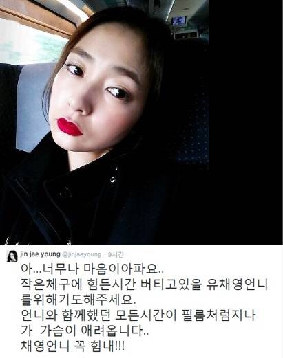 이어 "언니와 함께 했던 모든 시간이 필름처럼 지나가 가슴이 애려옵니다..채영 언니 꼭 힘내!"라고 유채영의 쾌유를 빌었다.