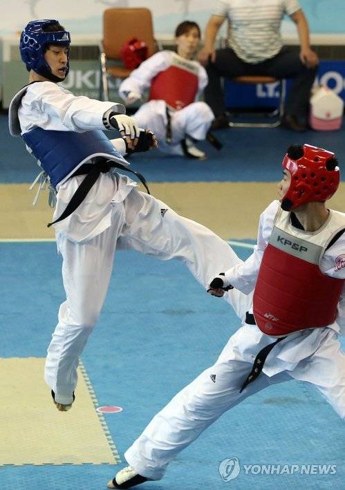 (서울=연합뉴스) 홍해인 기자 = 아시안게임 2연패를 노리는 남자 태권도 간판 이대훈(청색 보호구, 용인대)이 29일 오후 서울 강남구 역삼동 국기원에서 열린 인천아시안게임 국가대표 최종 선발전 63kg급 결승에서 박동호(세종대)를 상대로 날라차기 공격을 하고 있다. 2014.7.29