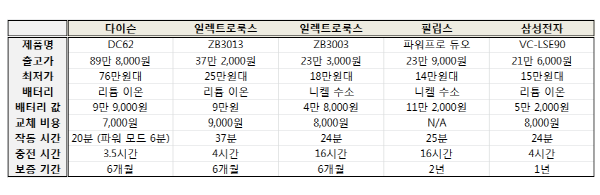 ▲ 브랜드별 무선청소기 배터리 비교 표