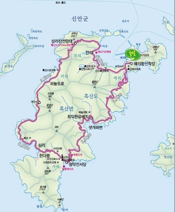 흑산도 코스: 예리항 선착장-최익현유배지-샛개해변-정약전서당-한다령-하늘도로-상라산전망대-예리항 선착장, 27.6km, 3시간30분/이미지제공=전라남도 |