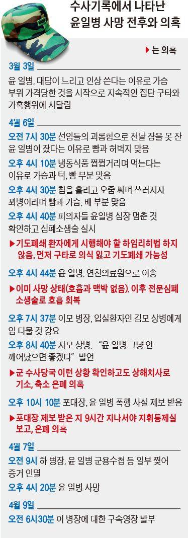 군인권센터는 7일 28사단 헌병대 수사기록 분석을 통해 윤모(20) 일병 폭행 사망 사건에서 불거진 사망원인과 시점, 군의 부실 수사 등에 대해 다양한 의혹을 쏟아냈다. 윤 일병의 직접적 사인은 당초 알려진 질식사가 아닌 구타에 따른 뇌손상 사망이어서 가해자들에게 살인죄를 적용해야 한다는 것이 핵심이다. 또한 군 당국의 조직적 사건 축소ㆍ은폐가 병행돼 사망 진단부터 사후 대응, 가해자 기소까지 '총체적 부실 수사'로 귀결됐다는 주장이다.